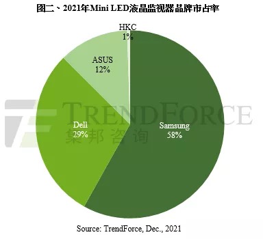 以本年搭载Mini LED背光的液晶监视器品牌市占率来看,三星(Samsung)以58%的市占率位居榜首,其Mini LED液晶监视器方针客群首要为电竞玩家,讲究高性价比。戴尔(Dell)则以专业创作者为其首要客群,故产品以高标准为首要诉求,以市占率29%拿下第二名。第三名为相同以专攻电竞玩家为主的华硕(ASUS),市占率约12%。